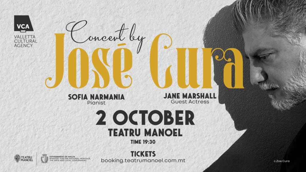 Internationally renowned Mro José Cura, accompanied by pianist Sofia Narmania, will perform a wide range of songs from his homeland Argentina, as well as one of his own compositions, a song cycle based on Pablo Neruda’s poetry. The concert will be held on Saturday 2nd October at the Manoel Theatre in Valletta.