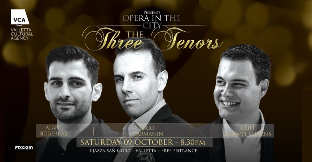 The programme includes world famous operatic tunes, starring Nico Darmanin, Alan Sciberras and Cliff Zammit Stevens accompanied by Sofia Narmania at the piano.
